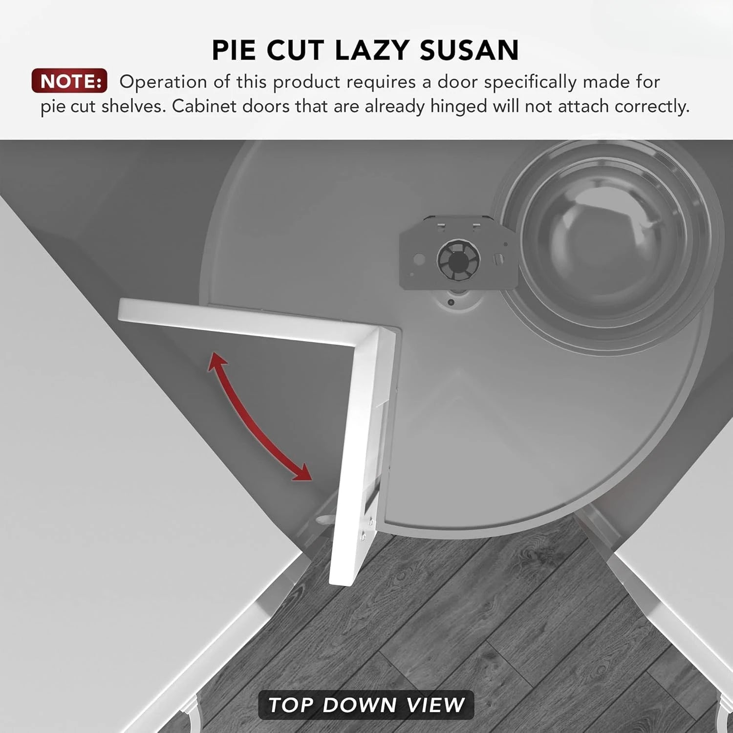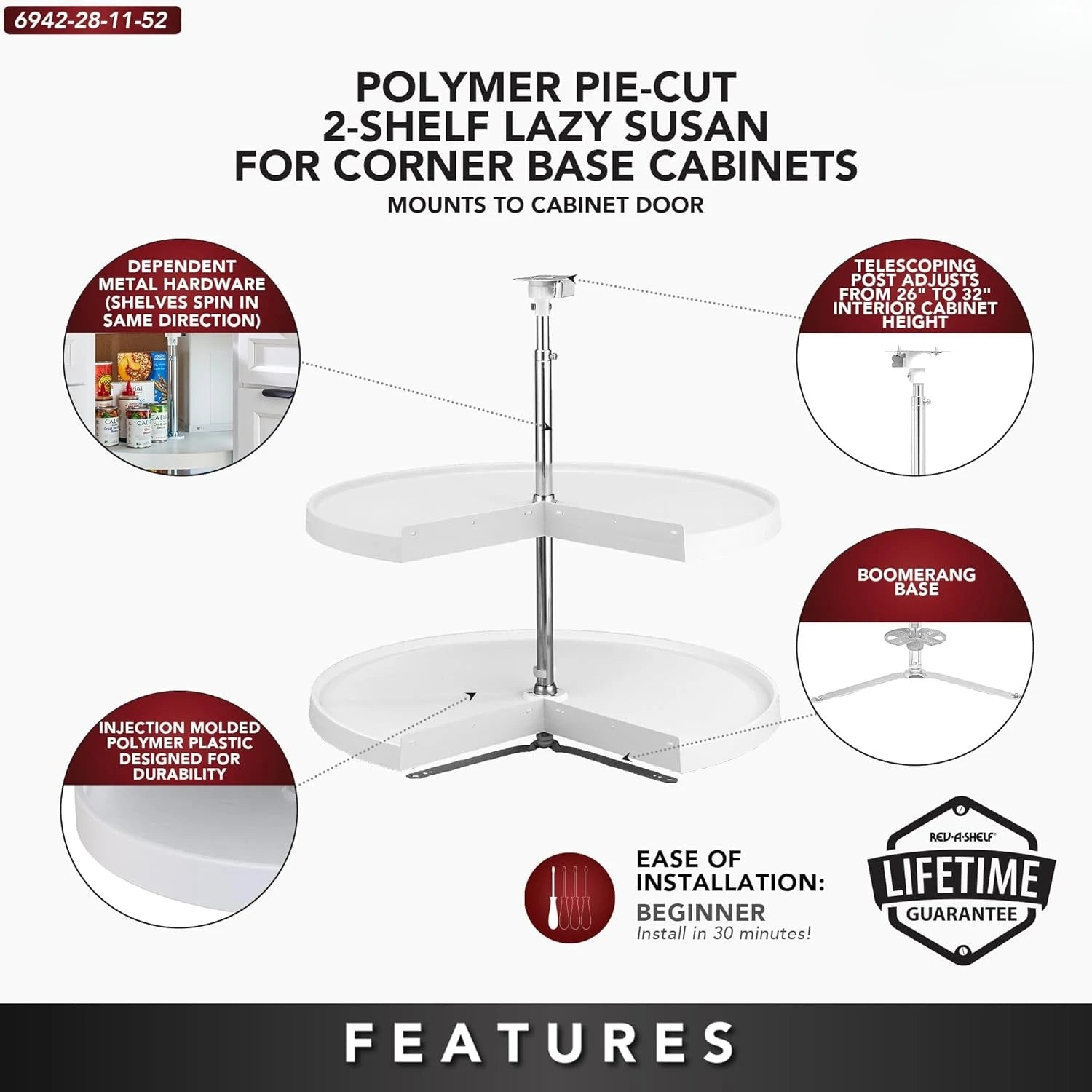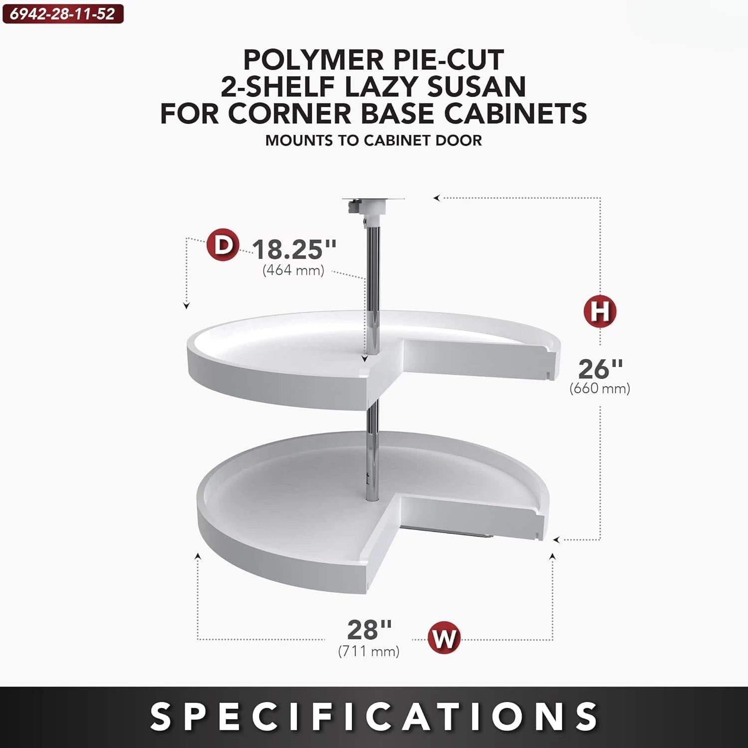 - Pie-Cut 2-Shelf Lazy Susans: Effortlessly organize your space with our Polymer Pie-Cut Two-Tier Lazy Susans for Corner Base Cabinets; dimensions: 28" W x 18.25" D x 26" H; weight per shelf: 68 lb.