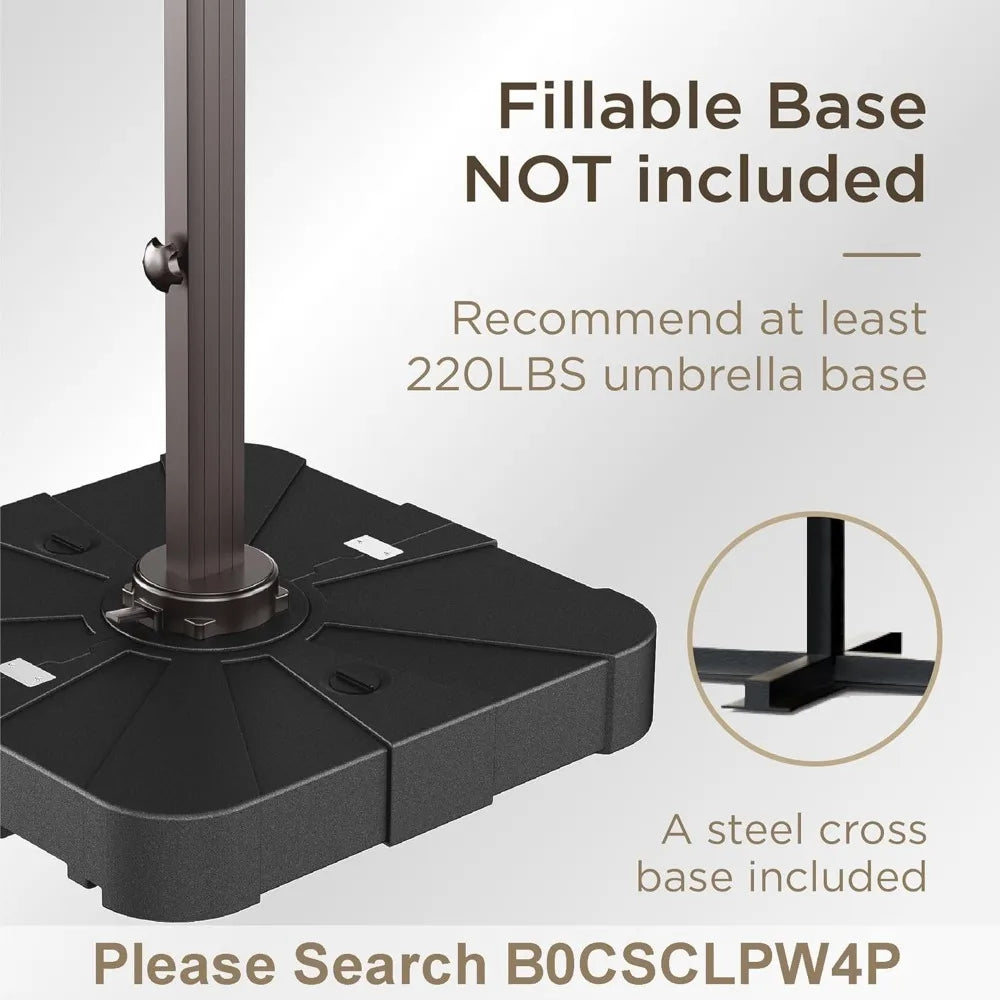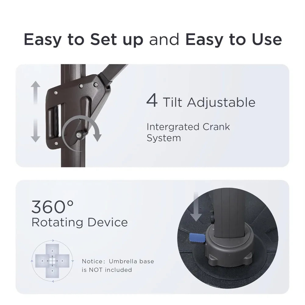- Stable Frame: Patio umbrella base in the picture is not included; Cantilever patio umbrella made of 8 heavy-duty ribs, which are anti-oxidation spray painted and powder coated, not easy to oxidize and rust and can withstand long-term use; Let's start enjoying outdoor patio umbrella