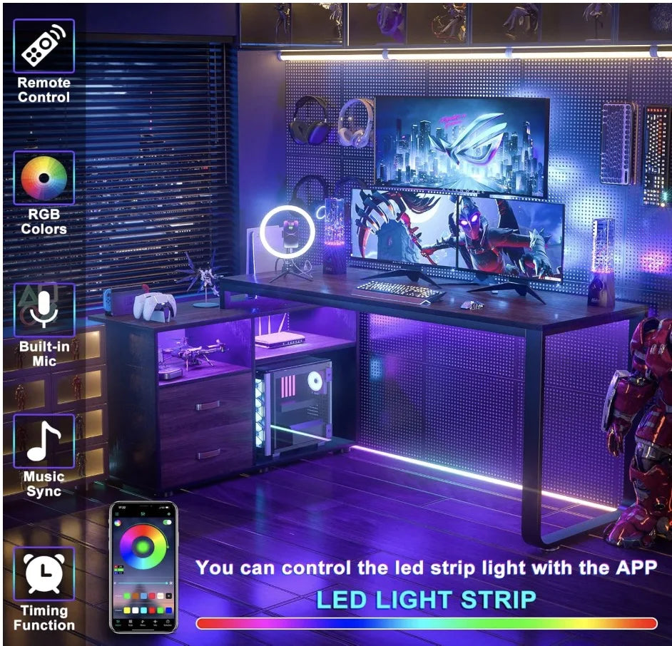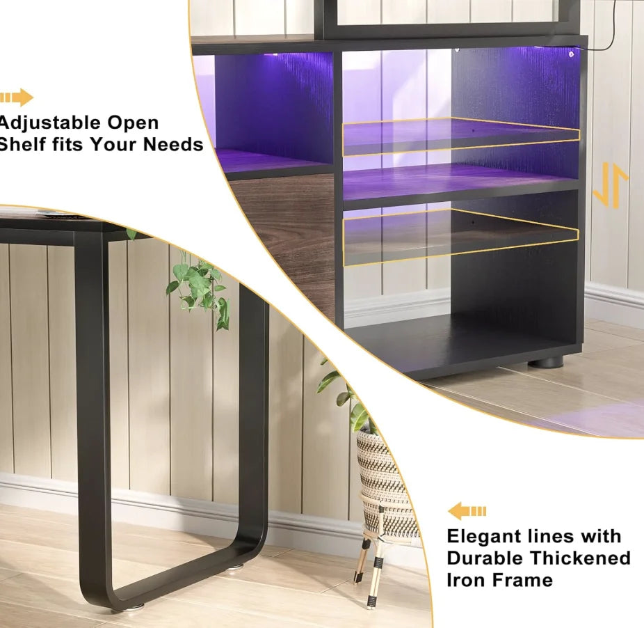 Computer Desk with Socket & Smart LED Lights: Built-in power charge station (3 regular outlets and 2 USB ports included), which allows keeping your laptop, tablet, printer or other everyday devices nearby while charged. You can also control the LED lights with the App, and customize any color you like. Meanwhile, it has a variety of modes like music sync, timer functions, etc, providing a great ambiance for whatever mood you are in.