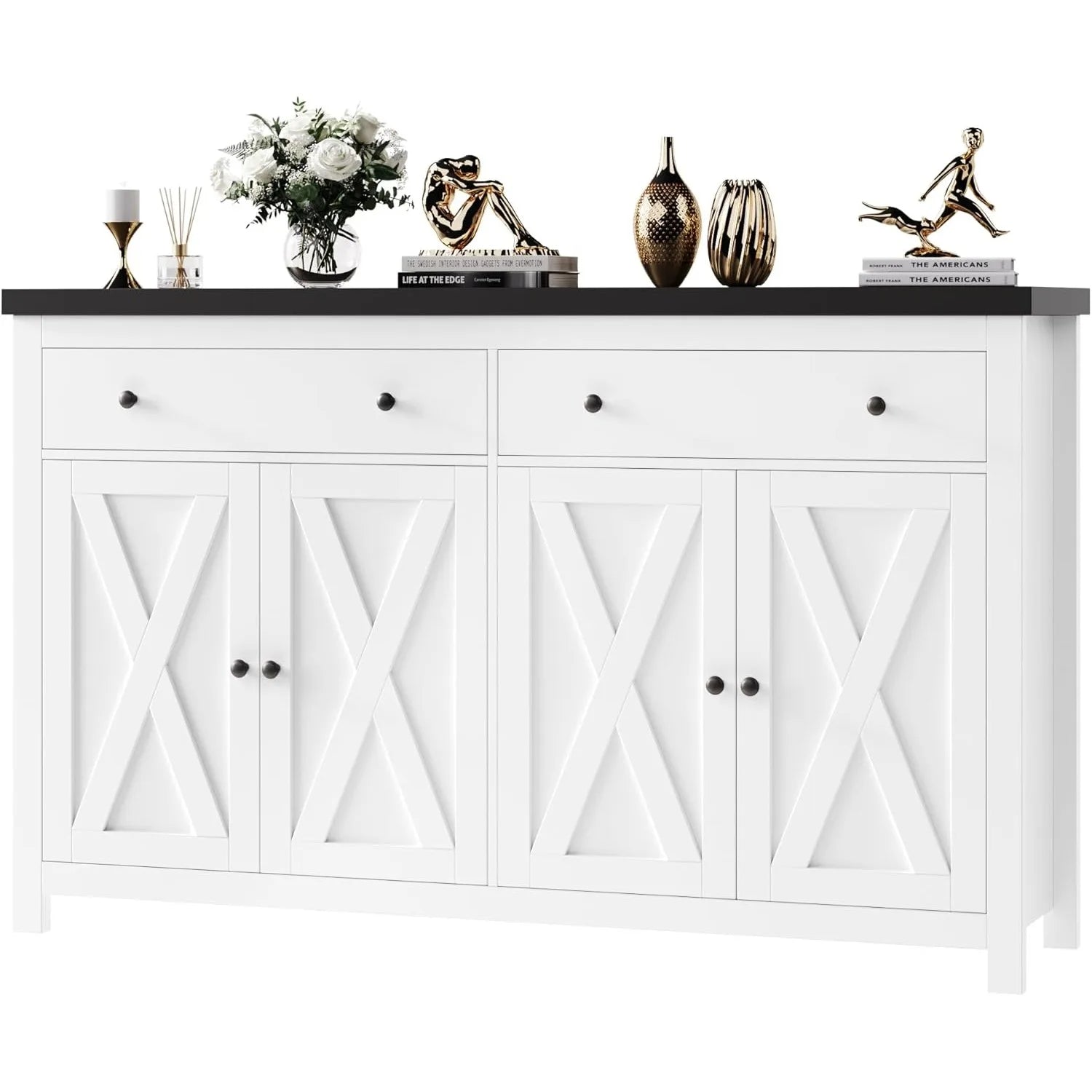 - Modern Style--Black tabletop and matte black metal handle of this white buffet cabinet, adds a great modern flair to your home. Together with white barn doors, this kitchen storage cabinet blends modern stylish elements with a distressed vintage look, to create a charming storage solution that matches most home decor.