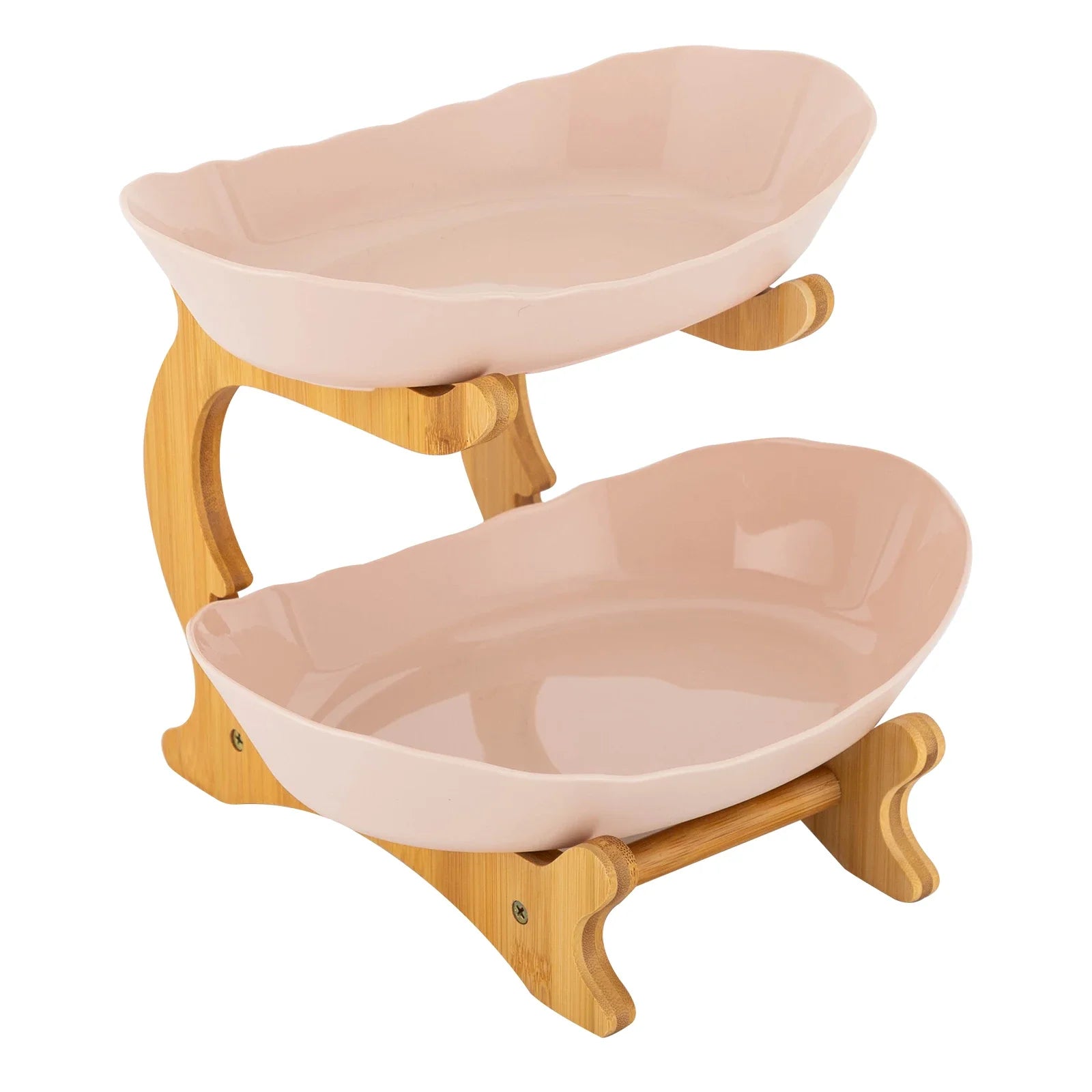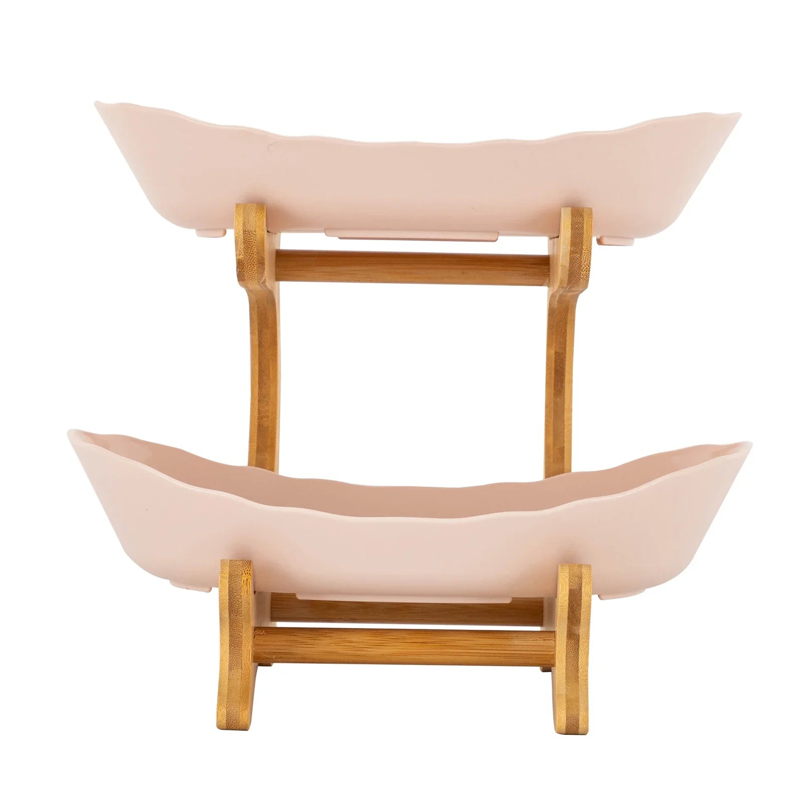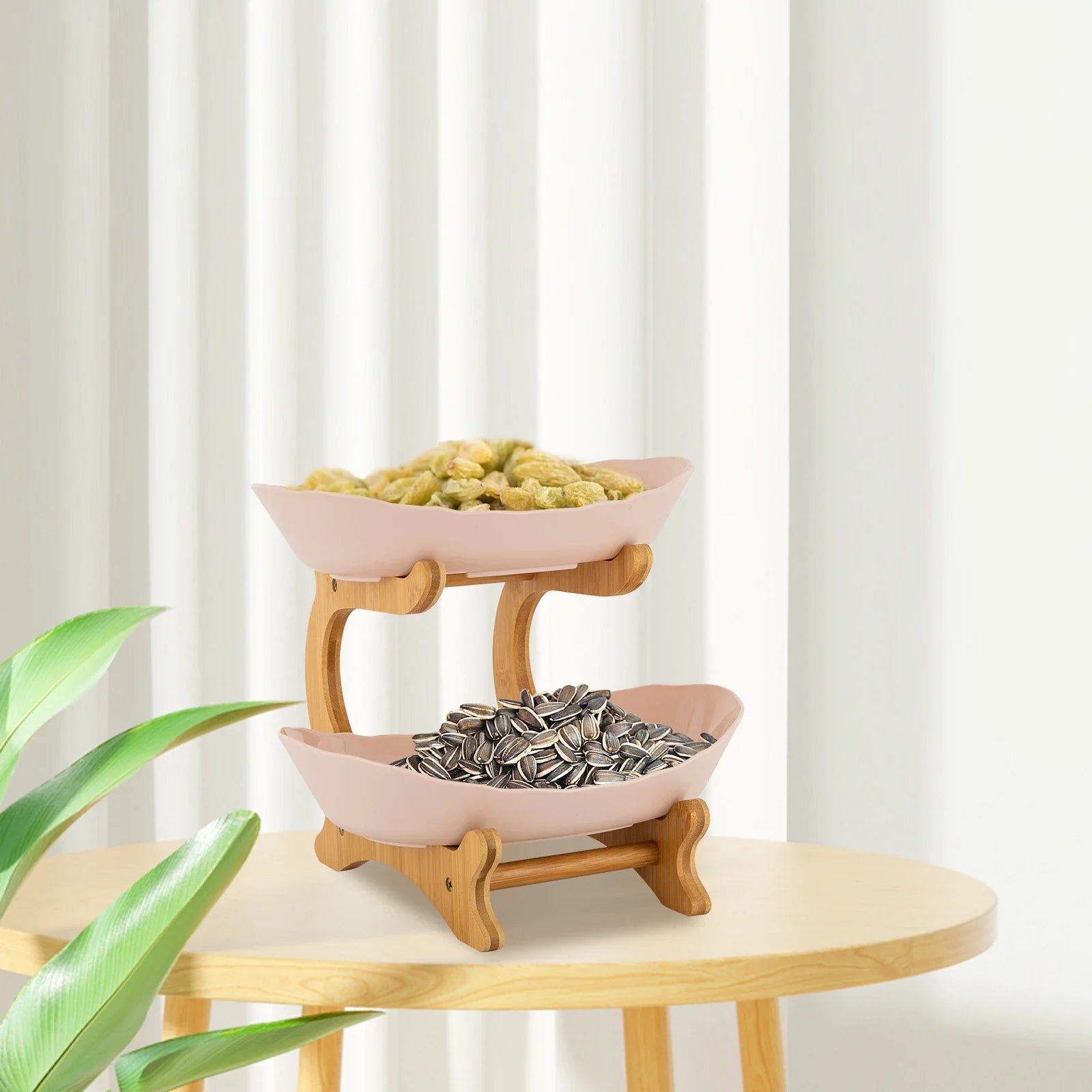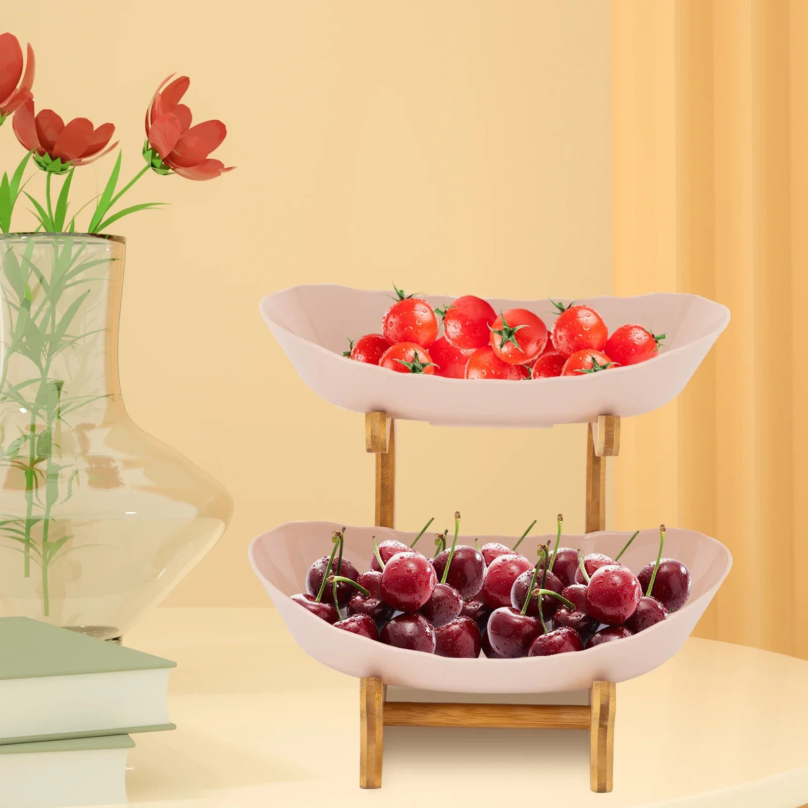 This two-tier serving dish consists of a natural bamboo wood frame and 2 food-grade PP bowls with an innovative split design that is both beautiful and functional. The open design is smoothly ventilated to keep fruits and vegetables fresh and easy to reach. The 2-tier design allows fruits to be categorized and displayed colorfully. Besides, the natural beauty of the bamboo-wooden frame adds a touch of freshness and natural style to your dining table, making it an ideal choice for a healthy lifestyle.